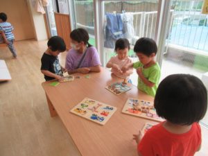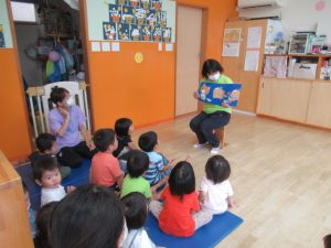 朝のお集まりで『くまちゃん もじもじ どうしたの?』の紙芝居を読みました。トイレに行くのが嫌なクマちゃん。パンツちゃんたちと一緒に行ったトイレには、ゆかいなおトイレさんが「パンパカパーン‼︎」とお出迎え。クマちゃんは上手におトイレが出来ました。「みんなはイヤだ〜って言わずにおトイレに行けるかな?」と聞いてみると「行ける!」と元気よく答えてくれましたよ🎵その後のトイレに行く時間はみんなスムーズに行けました。
