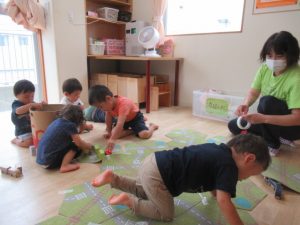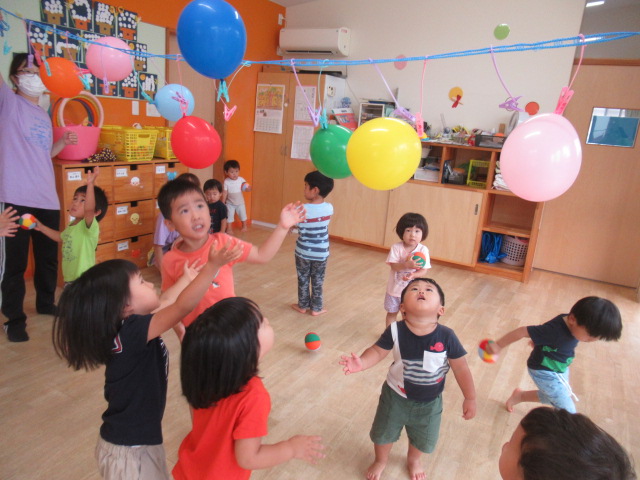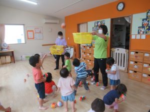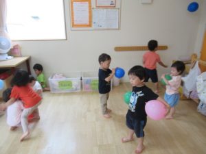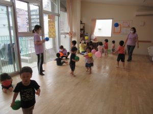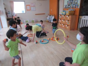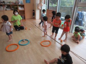 はじめに保育士がカゴを持って移動する玉入れをしました。ひとつずつ手に持ってカゴに入れるお友だちやたくさんの玉を両脇に抱えて1度に入れようとするお友だちもいましたよ。その後は少しルールのある遊びをしました。線を引いた所から出ずに丸い輪っかを狙って玉を投げてみました。大きいお友だちは、跳ねる玉の特性を生かしてバウンドさせて入れてみたりと工夫しながら遊んでいる姿に感心しました。小さいお友だちも大きいお友だちの真似っこをしながら楽しんでいましたよ。