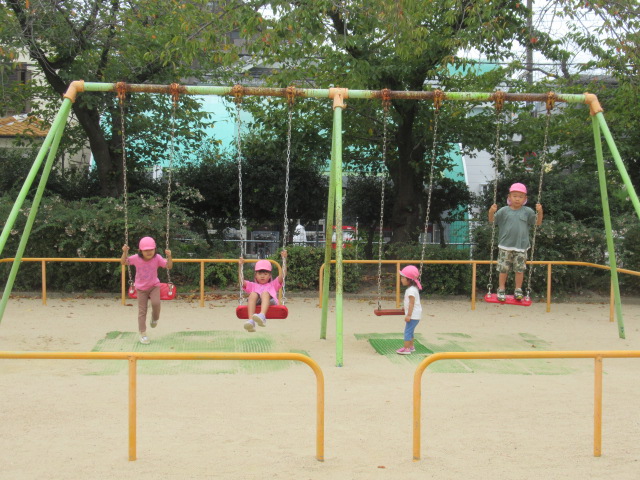 涼しい風が吹いていましたが、遊んでいるとうっすら汗をかきました。公園で遊具で遊んだり、木の実を拾ったり、ちょうちょを追いかけたりたっぷり遊んできました。今日は、普段は幼稚園に通っているお友だちが数名来てくれていたので一緒に遊んでもらったりする姿もありましたよ。鉄棒でこんなことできるよ!と成長っぷりも見せてもらいました。帰ってからシャワーで汗を流しました。