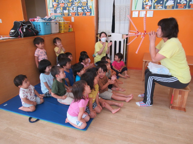 朝のお集まりで『吹き戻し』を見てもらいました。始めは、3つでシュルシュル~ピ~。戻ってくる時に面白い音が聞こえてくるので子どもたちは、大喜びです。少しずつ増やしていって最後は11本にチャレンジしてみました。かなりの肺活量がいるので保育士は必死です💦子どもたちから「がんばれ~‼︎」の可愛い声援があったので全部広げる事が出来ましたよ(^^)v