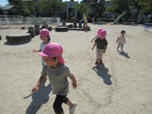雲ひとつない青空の下、守部公園までお散歩に行きました。公園では、丸太の遊具で遊んだりブランコや滑り台を楽しみました。どんぐりが落ちてないかと探していると、木に緑色に実っているどんぐりをお友だちが発見!「早く落ちてきて欲しいねぇ」と楽しみにしている声が聞こえて来ましたよ。「また、探そうね」と約束して帰ってきました。今日もとっても暑くて汗をかいたので、シャワーを浴びてスッキリしました。