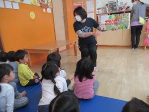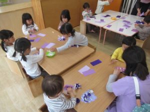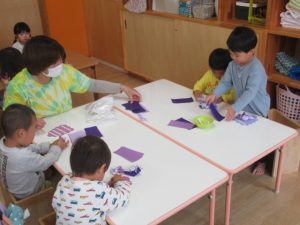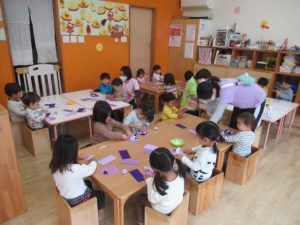 今月はみんなの大好きなぶどうを製作します!折り紙を半分に切ったサイズのものを丸めてぶどうの形に切った所に両面テープが貼っていて、紙の部分を剥がしてそこにペタペタ貼って出来上がり!お花紙より少し硬めの折り紙でしたが、何度も経験してきたので丸めるのも上手でしたよ!仕上がったぶどうを見せて「食べても良いよ!」と優しい子どもたちでした^ ^
