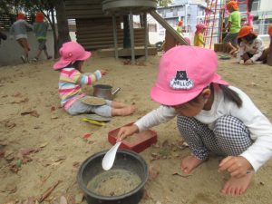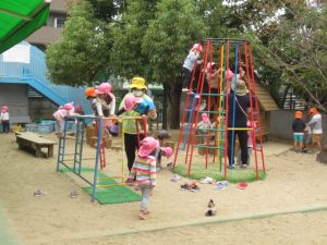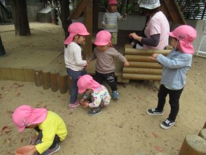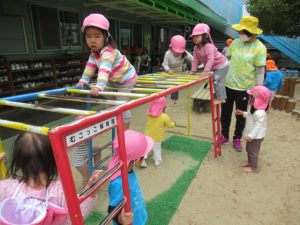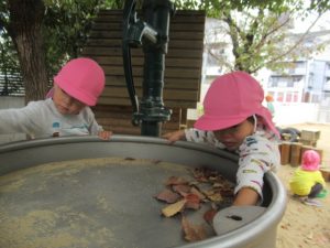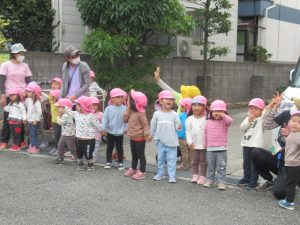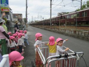 お集まりで電車の絵本を読んだので、阪急電車を見に散歩に出かけました。バスやトラックを見つけて喜んだり、道行く方から「何歳?」と聞かれてそれぞれが2歳!3歳!と大きな声で応えて元気いっぱい^_^電車の踏切の音が鳴る度にどっち⁈どっちから来るの⁈とキョロキョロして電車が目の前を通るとぴょんぴょんとジャンプして大喜び。いっぱい電車を見て満足して帰って来た後は、園庭でも遊んで楽しみましたよ。