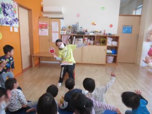 【だるまさんが】のペープサートを見ました。絵本と同じ内容なのでみんなお馴染みです。だるまさんが…びろーん!と伸びるところは、みんな両手を上げてだるまさんみたいに伸びていて、真似っ子がとても上手なんですよ😆✨