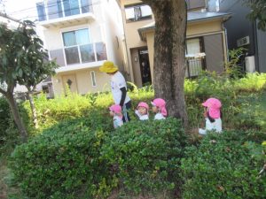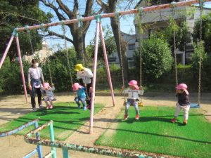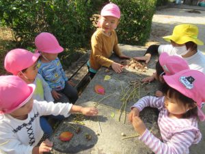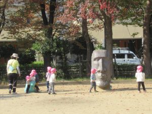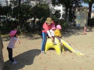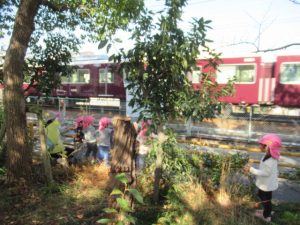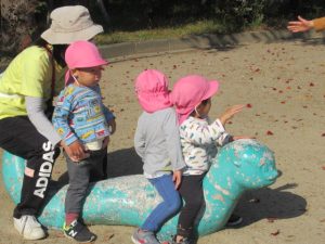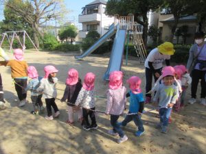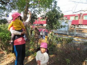 電車の見える高倉公園へお散歩に行きました。たくさん通る電車に、お~いと手をふるどんぐりさんたち。絵が描いてある電車にも会えましたよ!ブランコや鉄棒の遊具も人気ですが、テーブルと椅子がある場所で焼き芋を作ったりと、おままごと遊びもお友達と一緒に楽しんでいました。帰る前に長いロープを使って電車ごっこ。みんなでどんぐり電車に乗りこんで、出発進行ー!ごっこ遊びに興味を持って遊んでいるお友達が多いので、これからも色々なごっこ遊びが出来たらいいなぁと思います😊