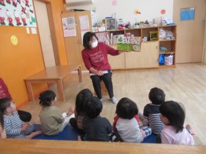 『ケチャップれっしゃ』の絵本を読みました。”けちゃけちゃ”と走ってくるケチャップ列車は森で出会ったお料理に”ふっちゅー”とケチャップをかけて美味しく仕上げます。絵本を読んでいると「ポテトにケチャップつけて食べたらサイコー!」と言うお友だちがいて一同「うんうん」と納得^_^「今日の給食はケチャップのナポリタンだよ〜」と伝えると嬉しそうな子どもたち。給食の時間もいっぱいおかわりしていましたよ。
