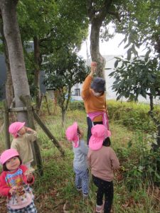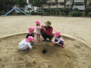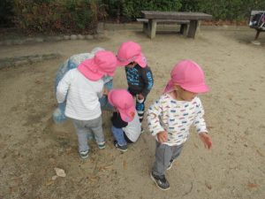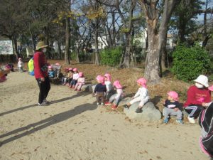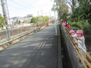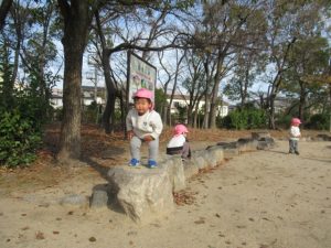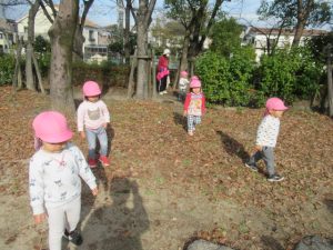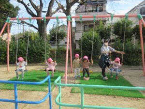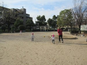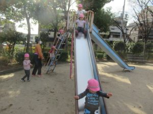 お散歩に行く前は、トイレを済ませて手を洗い、帽子を被って靴を履いて全員揃うまで待ちます。今では早く準備出来る様になっていて、小さい子の帽子を被せてあげたり、1人で靴を履けないお友だちを手伝ってあげたり、周りのお友だちを気遣う姿も見られる様になりました。お散歩中にも一緒に手を繋いでいるお友だちに「手は離したらあかんよ」と言ったり道路の端を歩く様に誘導してくれたりと、頼もしいお兄さんお姉さんがいっぱいです。公園に着くと滑り台やブランコ、大好きな電車を見たり、サッカーをして走り回って遊びました。