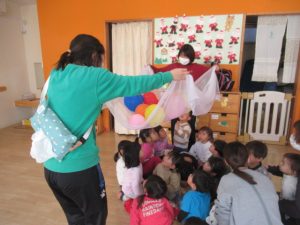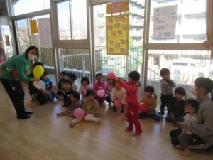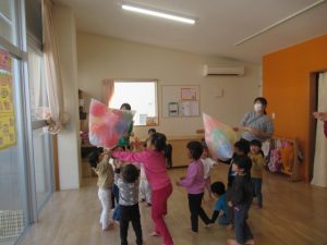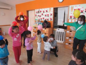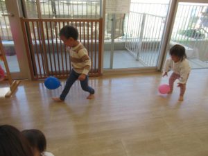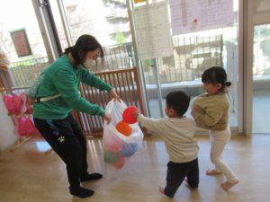 風船を使って色々な遊びをしてみました。まずは上に高ーく投げてキャッチ!うまくできなくても一生懸命風船を追いかけていましたよ。次は足でキックして、マテマテーと追いかけました。風船がいろんな所へ飛んで行くのが楽しそうでした。次は頭の上に乗せて落ちないようにバランスをとります。「先生見てー!できたー!」と子どもの方を見ると、風船がピタッと静電気で頭にくっついていました。すごーい!とみんなに言われて嬉しそう😊その後、風船玉入れをしました。風船は真っ直ぐ飛んでいかないので袋に入れるのが中々難しいですが、どんぐりさんは最後まであきらめません!全部の風船を入れることが出来ました!最後は袋に入った風船をキャッチできるかな?みんなで手を伸ばして風船の入った大きな袋をキャッチしました!