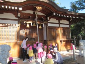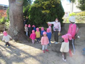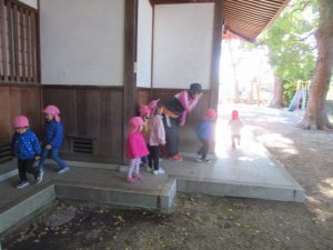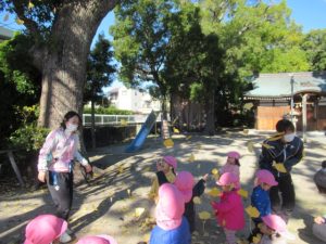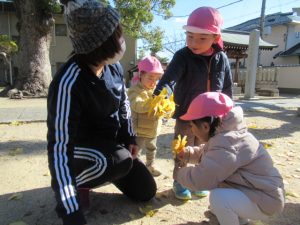 まずは神社の神様にご挨拶して、イチョウの葉が落ちている所へ行き、きれいな葉を集めたりパラパラと上から振らせたりして遊びました。落ち葉が豊富なこの季節ならではの遊びをたっぷり楽しみました。神社へ行くとよくかくれんぼをするのですが、それを覚えていたお友達が木の陰に隠れ始めました。楽しいことはしっかり覚えているものですね。それからみんなでかくれんぼをして遊びましたよ。