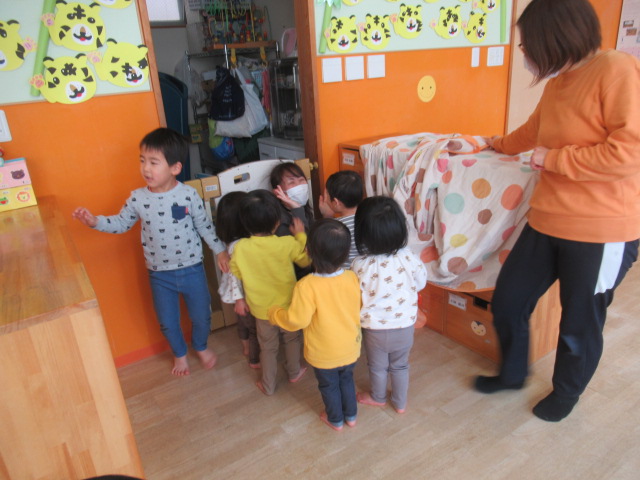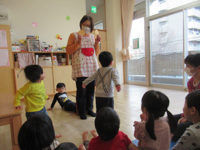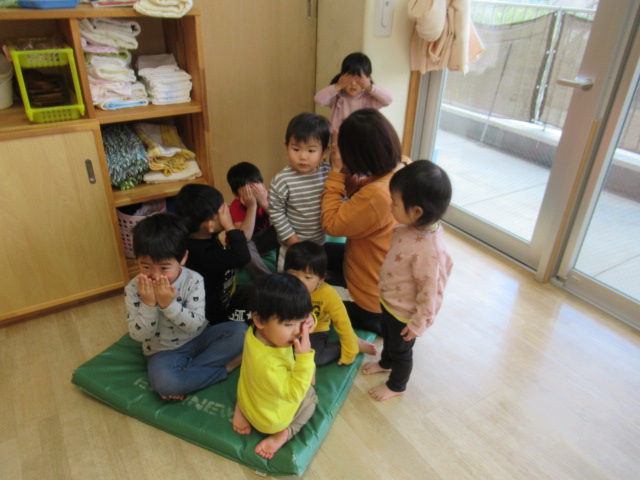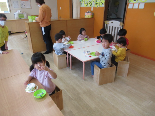 エプロンシアターをしました。うた『ふしぎなぽけっと』に合わせて、ポケットをたたくたびにクッキーの枚数が増えていきます。最後はうそっこでみんなで食べました。