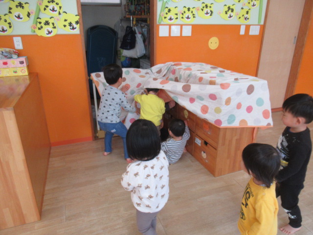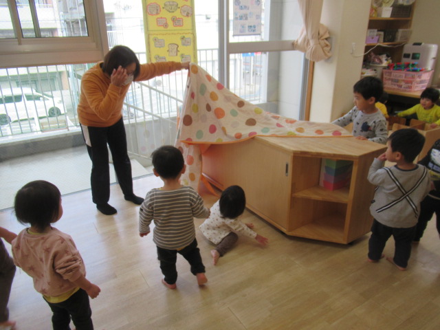 ワクワクドキドキが隠せない子どもたちの表情がとてもステキでした。最初はおとながかくれて探してもらったのですが、自分たちも隠れたくてうずうずしていたのでこどもたちにもすぐにタッチ交代してかくれてもらい繰り返し遊びました。