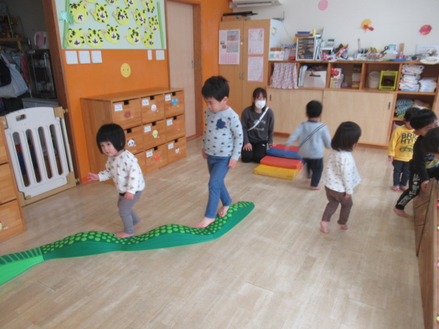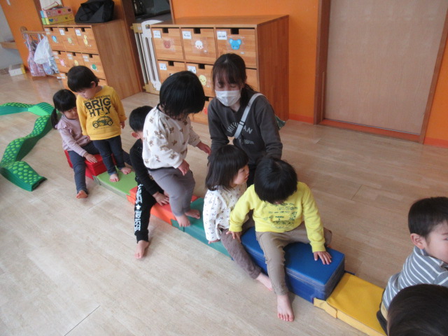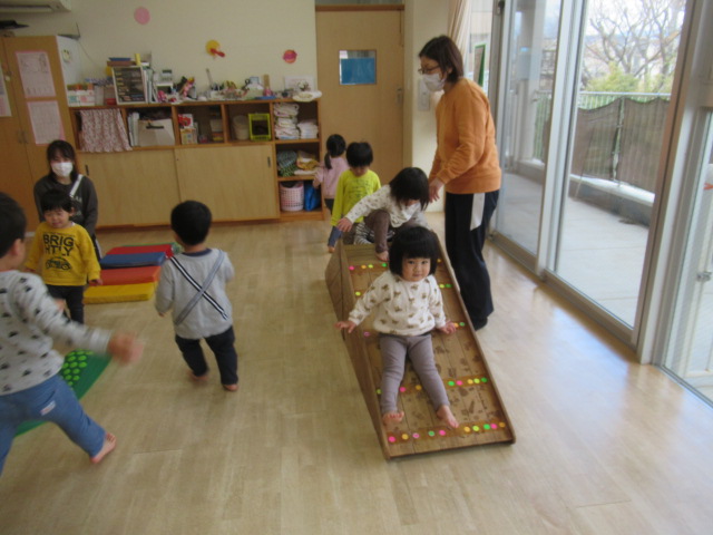 三角滑り台とでこぼこ道を二種類用意しました。気に入ったところで思う存分遊ぶ子もいれば、まんべんなく回って遊ぶ子もいて楽しみ方がいろいろでした。