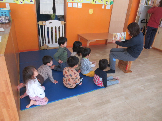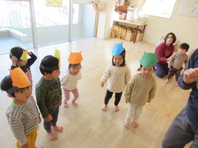 お集まりで、絵本 おにの子あかたろうシリーズのお話を読みました。鬼の子どもがお友だちと遊んだり冒険したりするお話です。みんなも鬼さんになって遊んでみようと誘ってお面を選んでもらいました。