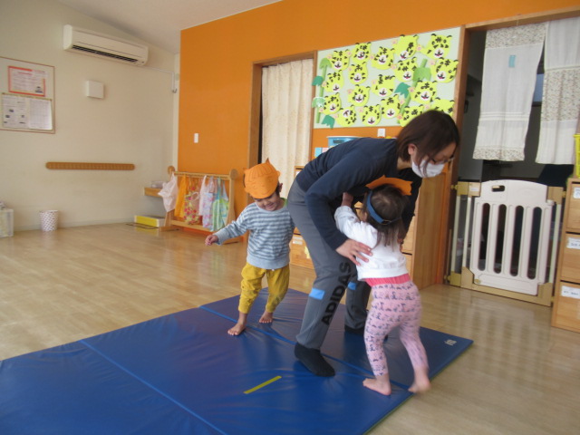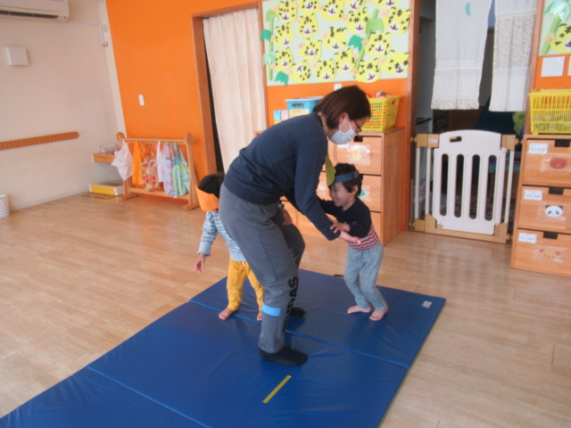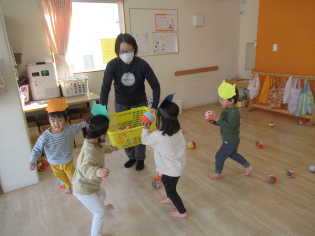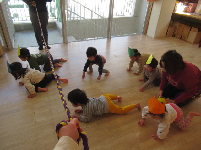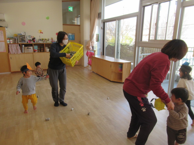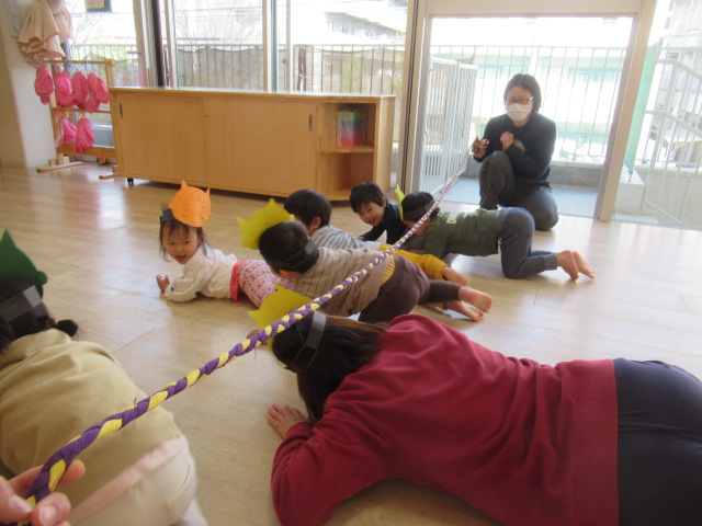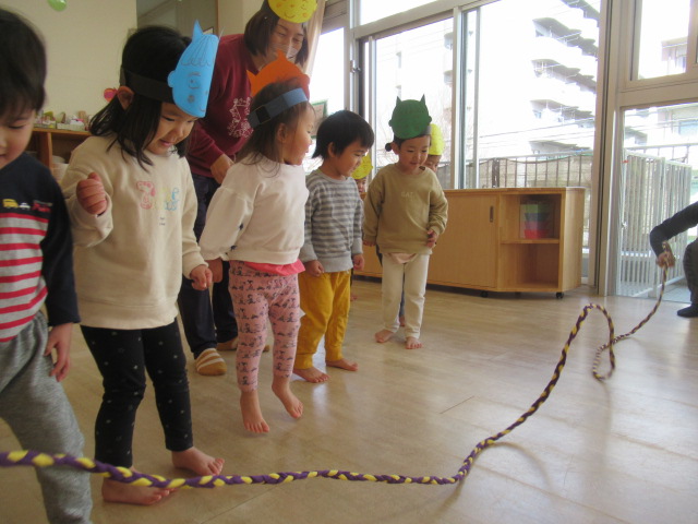 お面を被った子どもたちは、すっかり嬉しくなったようでした。鬼さん歩きをすると強そう!鬼さんの苦手なお豆を投げても走って逃げて、豆は鬼さんたちに全然当たりません。お相撲をしたら強い力で押してきてびっくりしました。手強い鬼さんたちだったので縄でいろんな難しいことに挑戦してもらいましたがどんぐりの鬼さんたちはとっても強くてすばしっこくて驚きました。