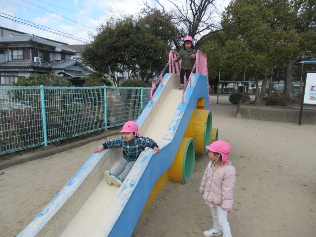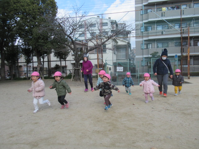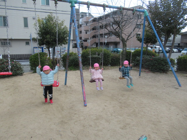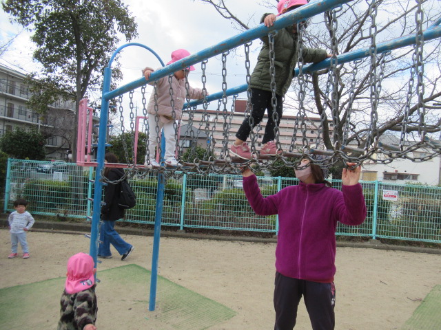 近くの公園へ遊びに行きました。遊具で遊んだり、鬼ごっこをしたりしました。鬼ごっこは「もう1回!」と何度も何度も遊びました。