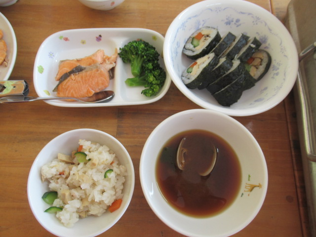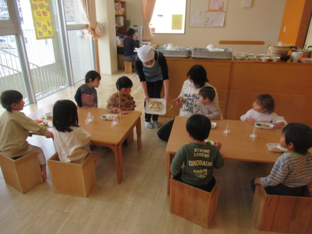 少し早いですが、今日はむこっこ保育園に鬼さんが来る日だったので節分の行事食でした。鬼さんの顔のお寿司にみんなびっくりしていました。