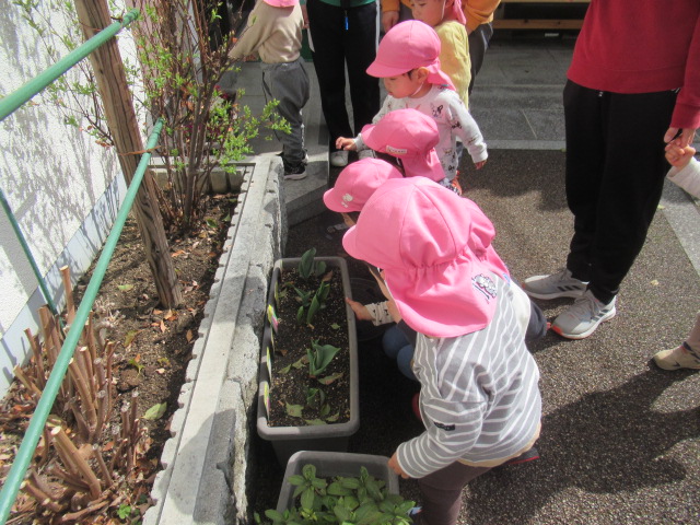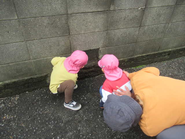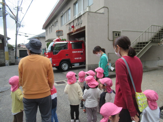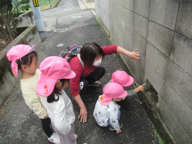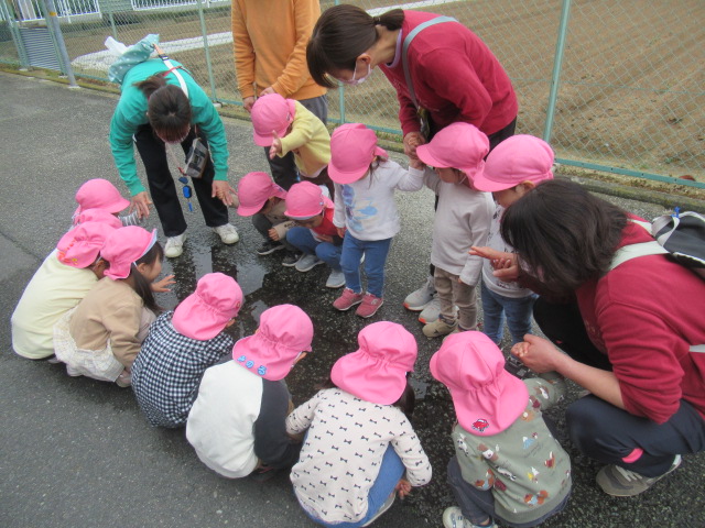 雨がまだ道路に残っているので、水溜りを探しに行こう!と出発しました。水溜りをのぞくと何か見えるかな?と子ども達に聞くと「魚!」「サメ!」などかわいい答えが返ってきました。早速水溜りを発見。みんなでのぞいてみると何が見えたかな?ぜひお子さんに聞いてみてくださいね😊それからのぞき穴を見に行きました。順番交代で代わりながら見ることができましたよ。帰りに神社に行こうとしたら消防車が停まっているのが見えたので近くで見せてもらいました。消防団の方が警光灯を点灯してくれてみんな大喜び😆大きなホースやスイッチなども見ることができました。その後に神社の境内におじゃますると、チューリップを見つけました。まだつぼみがつく前で、これからどんぐりさんのように大きくなるんだね!と言って眺めていました😊