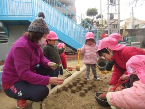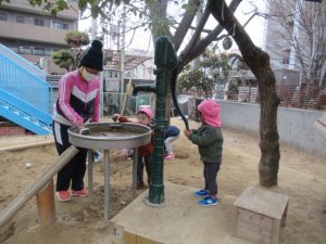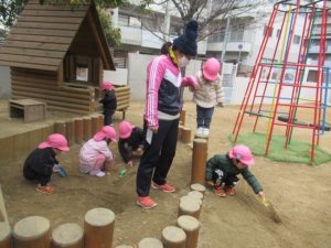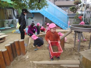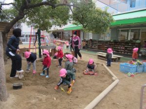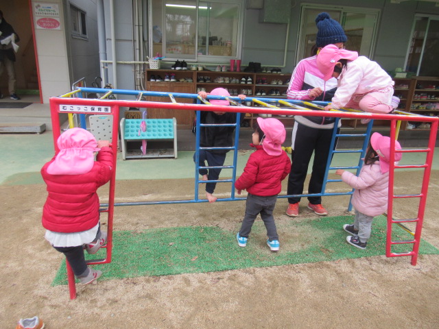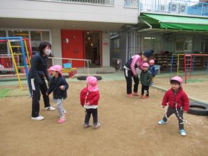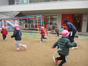 今にも雨が降りそうな天気でしたが、外で遊びたい子供たち!園庭で遊びましたよ♪砂場、八角ジムなど寒さに負けずに遊びました。でもやっぱり寒い💦というお友達と一緒にしっぽ取りをして遊びました。一生懸命しっぽを追いかけているうちに、体がポカポカになりましたよ!