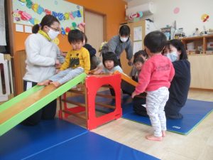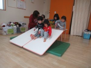 お部屋に戻り、すべり台で遊びました。すべり台が大好きな子供たちは、はやくすべりたくてしかたがありません。でも、その気持ちをがまんしてすべる前の約束をちゃんと聞いていましたよ😊でこぼこの坂道を手を持たないで登れるお友達もいました。部屋でも体を動かして遊びました😊