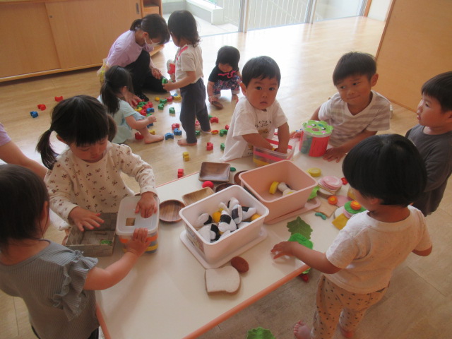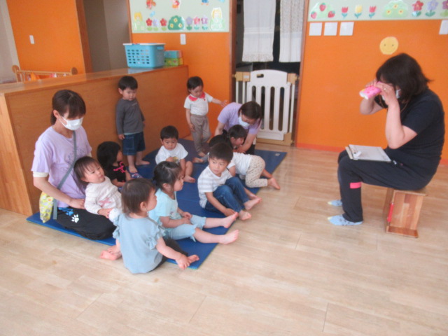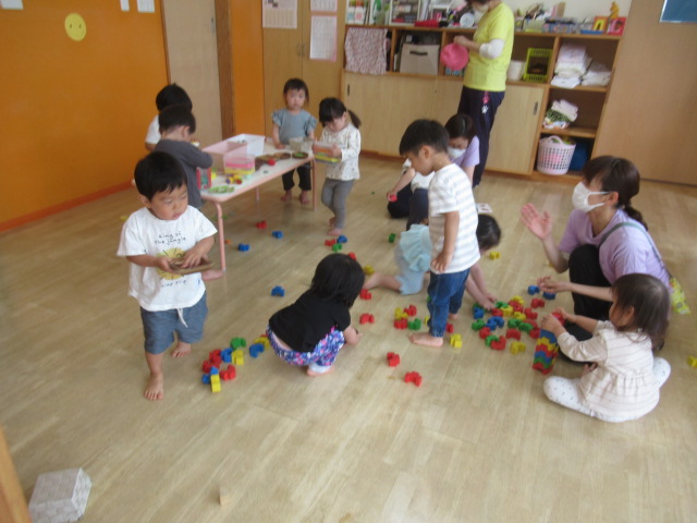 朝のお集まりでは、青いマットの上に座って朝のご挨拶から始まります。今日は、手作りの双眼鏡で「上手に座っているお友だちは誰かな〜」とのぞいているとみんなニコニコしながらこちらを見てくれてお返事もとっても上手でしたよ♪