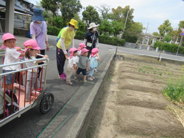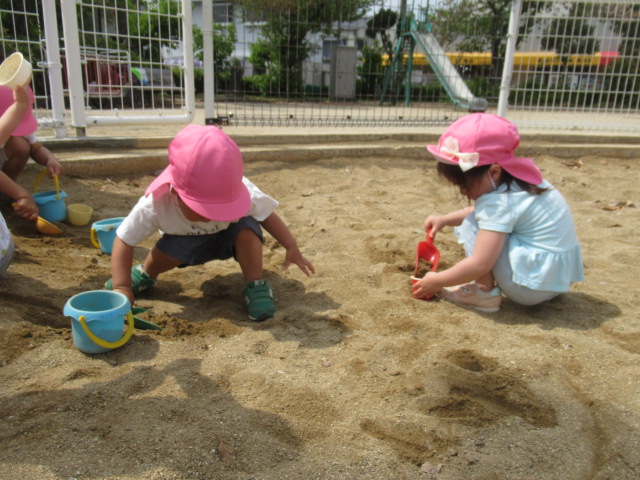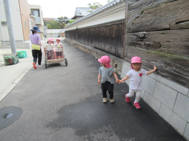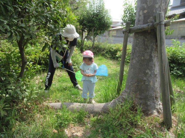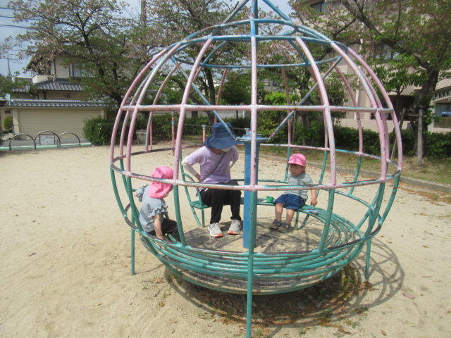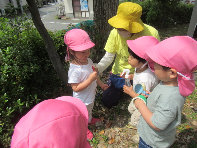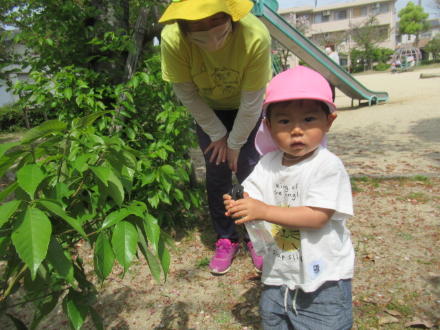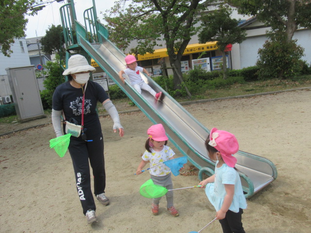 お友だちと一緒に手を繋いで公園へお散歩に行きました。道中は、色とりどりのお花をみたり、蜘蛛の巣を見つけたりしながら楽しく歩き公園へ到着。公園では、滑り台やお砂場で遊んだり虫取り網を片手に虫を探して遊びました。今日は、残念ながら虫は見つかりませんでしたが、蟻🐜を見つけて観察したりタンポポの綿毛を飛ばして大喜びの子どもたちでした^_^ 帰り道、お家の人に会いたくなって泣き出したお友だちに「ボクが居るから大丈夫だよ」と優しい言葉をかけてくれるお友だちがいてほっこりしました。