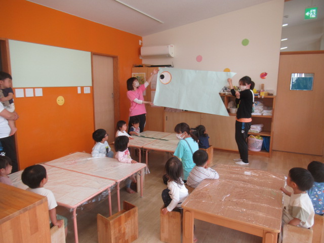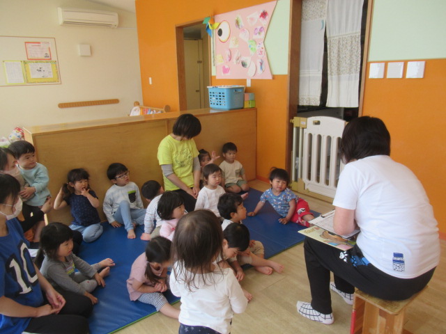 朝のお集まりで『だれがあそびにきたのかな』の紙芝居を見ました。窓から見えるヒントをよく見ていて遊びに来た動物たちをぜーんぶ当てていましたよ。当てっこしたり、かくれんぼの絵本が大人気です。