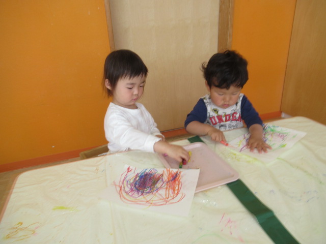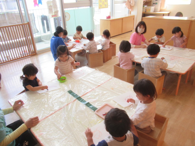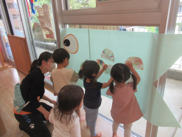 今日は、おおきいまごいのお父さん鯉のぼり🎏をみんなで作りました。白い紙に好きな色を塗りウロコの型に切ったのを貼って完成です!全色のクレヨンを使ってクルクルと円を描いたり、1つの色で隙間なく塗って仕上げたり、それぞれ素敵なお父さん鯉のぼりのお洋服が仕上がりました!是非お子さんと一緒に見て下さいね♬