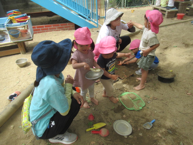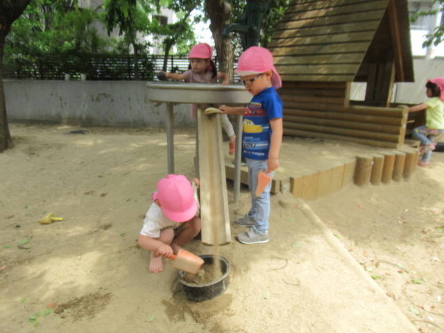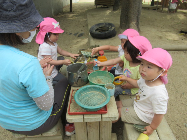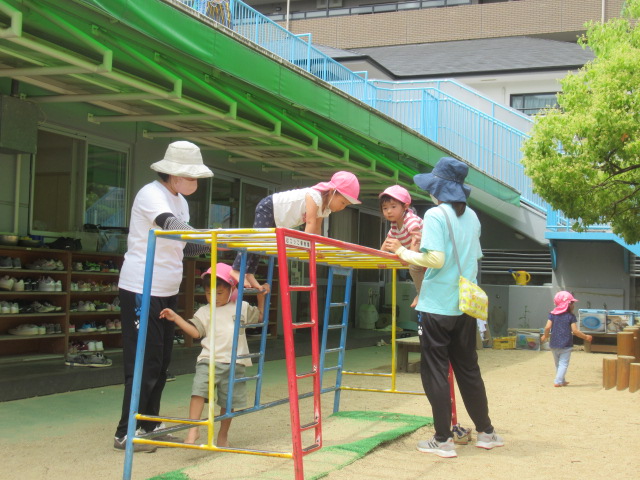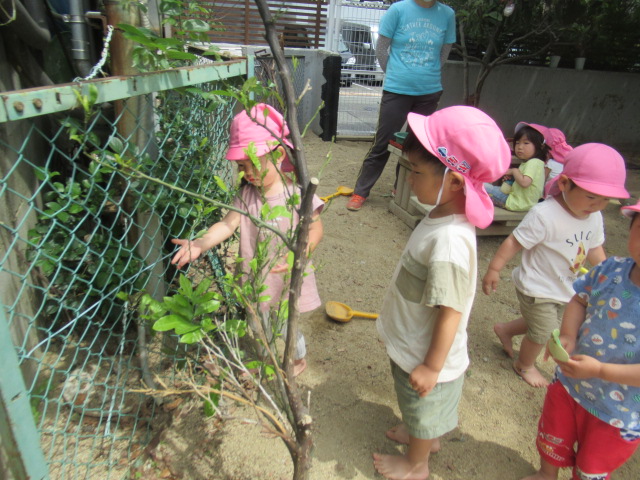 外に出た途端、園庭にある鯉のぼり🎏を指差して「さっき作ったねぇ〜」と子どもたち。鯉のぼりの鼻歌も自然と出てきて楽しそうに遊んでいましたよ。木のテーブルでは(お砂で)お茶やお菓子を作り女子会⁈が開かれていたり、みかんの木にやってくる蝶々を観察しているお友だちやお砂場では幕の内🍱弁当作りに葉っぱや小枝、小石を集めて大忙しでした^_^ 雲梯も「(高い所)怖い〜」と言っていたお友だちも何回か練習すると平気になって楽しんでいました♬それぞれが、好きな場所でたっぷりと遊びました。
