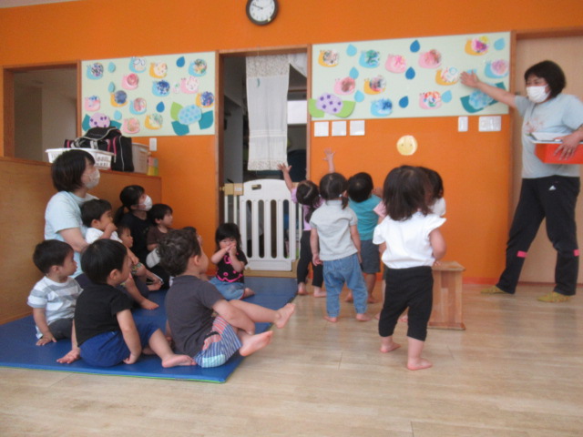 お集まりで、この間みんなで絵を描いて水の霧スプレーでシュッシュッと吹きつけて作った絵が色とりどりのかたつむりのお家になりましたよ♪と、みんなと一緒に見ました。とっても素敵なかたつむりに仕上がりましたよ〜🐌それからみんなで手作りのマラカスを振りながら『かたつむり』や『かえるの歌』を一緒に歌いました。