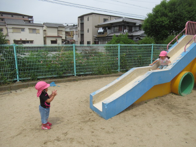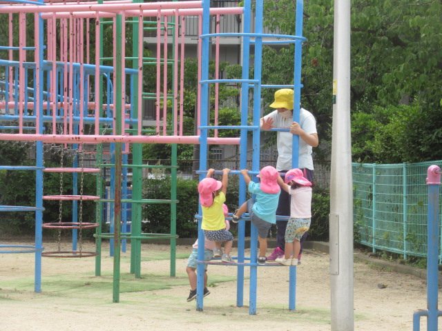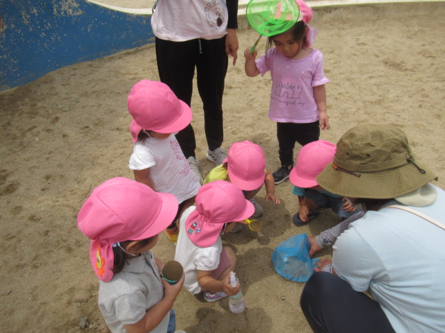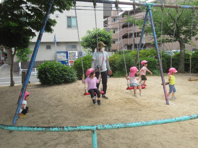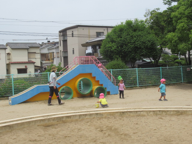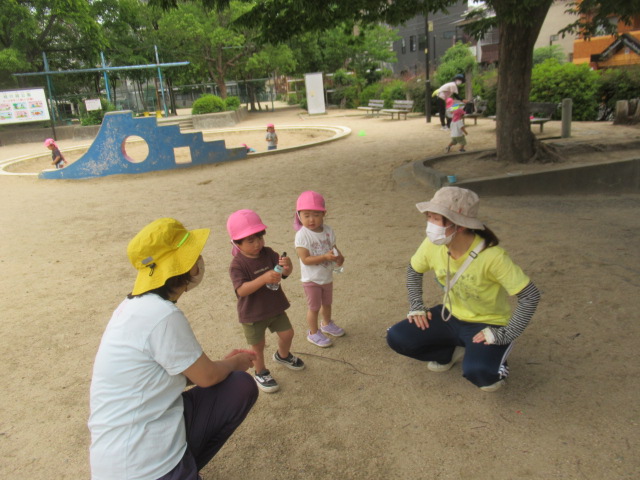 お出かけ前に水分補給をしっかり摂っておトイレも済ませて公園へ出!!途中、車の下でお昼寝している猫ちゃんを見つけた子どもたち。「お布団かぶってなーい、寒くないかなぁ〜」と言っている優しいお友だちもいましたよ。綺麗に咲いている紫陽花を見て「どんぐりにもあったなぁ〜(壁面飾り)」と思い出してお話していました。以前にどんぐりやお家で見たり聞いたりした事が日々の生活の中で繋がっていってるんだなぁ〜と嬉しくなりました。公園では、お砂場や滑り台で遊んだり保育士が捕まえた蝶々🦋を一緒に観察して過ごしました。初めて大型遊具にチャレンジしているお友だちもいましたよ。たっぷり遊んで帰って来ました。