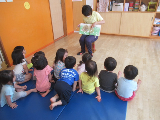 朝のお集まりでは、マットの上に集まって絵本、手遊び、季節の歌、ペープサートなどなど、みんなと一緒に楽しめる時間を設けています。絵本や歌の楽しさをお友達と一緒に味わい、共感しあうことで、別の場面でも他のお友だちの存在に気付けたり、関係が深められたりします。大切なひとときです。
