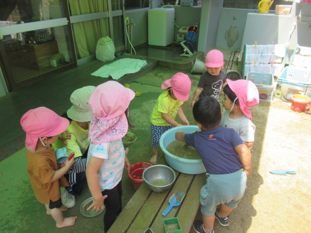 園庭に水をまいて少し湿らせ、タライやバケツにも水をためて自由に遊べるようにあちこち置いて楽しみました。砂に混ぜて遊んだり、そのままの水を容器に入れてご飯屋さんやおやつ屋さん、それぞれたっぷり遊びました。水をまいている所に自らかかりに来る大胆なお友だちもたくさんいました。この夏も水遊びを楽しめそうです!