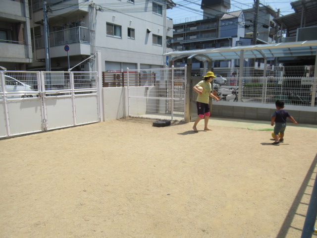 これから暑さが増すと泥んこ遊びなど水を使って遊ぶ日が増えて来ます。泥んこになった衣類は簡単に手洗いさせて頂いています。保育しながらなので落としきれていないものもあるかと思いますがご了承ください。また、半ズボンのご準備もお願いします。