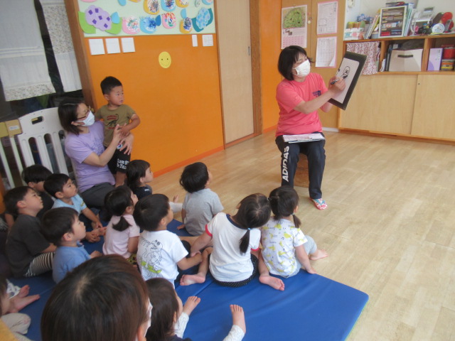 今日は6月6日の雨☂️こんな楽しい絵描き歌があるよ^_^と『6月6日の絵描き歌』を描いてみました。カエルかな?カエルじゃないよーアヒルだよ♪絵が変わる度に自分たちで想像した物を次々と答えながら出来上がったのはコックさん。コックさんって何?と子どもたち。「ご飯作ってくれる人だよ」と伝えると「ママはそんな帽子かぶってないで〜」と子どもたち。「ケーキ屋さんが被ってた~」と教えてくれたお友だちもいましたよ。よ~く見て覚えているんですね^_^