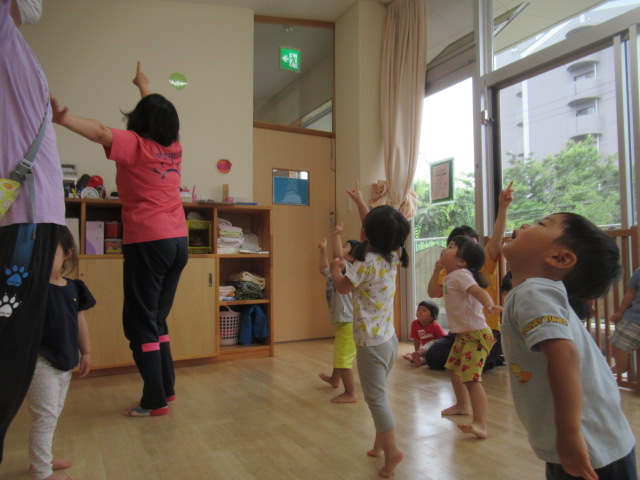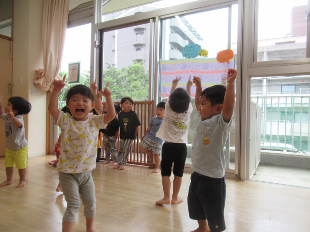 夏のプール遊びに向けてプールに入る前の簡単な体操をやってみました。保育士の真似っこをしてお猿さんやカラスさんになったりしながらしっかり身体を動かしました。夏のプール遊びが楽しみだね。