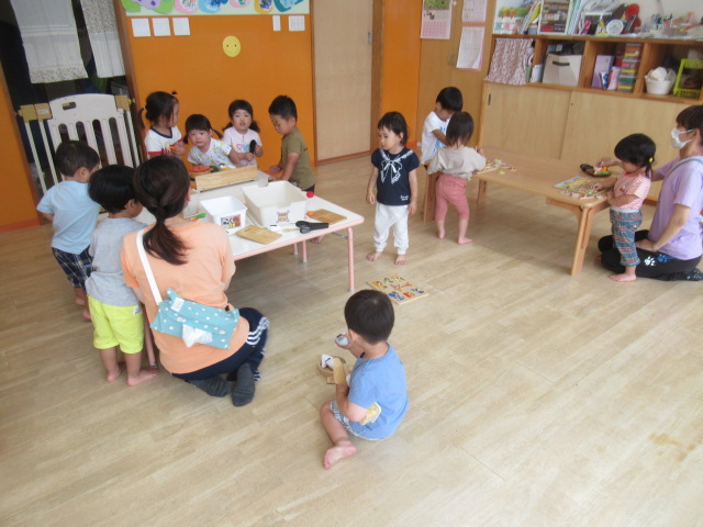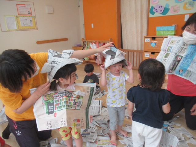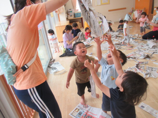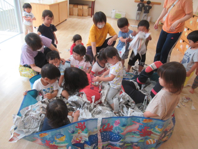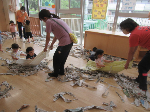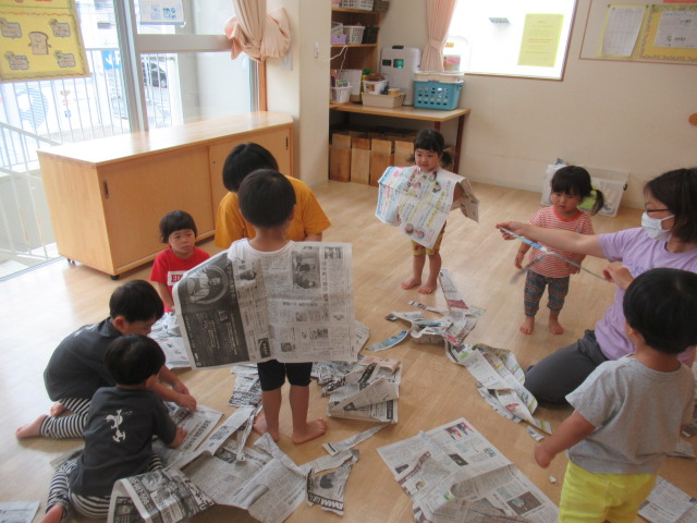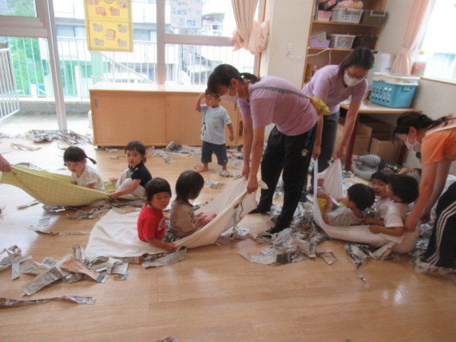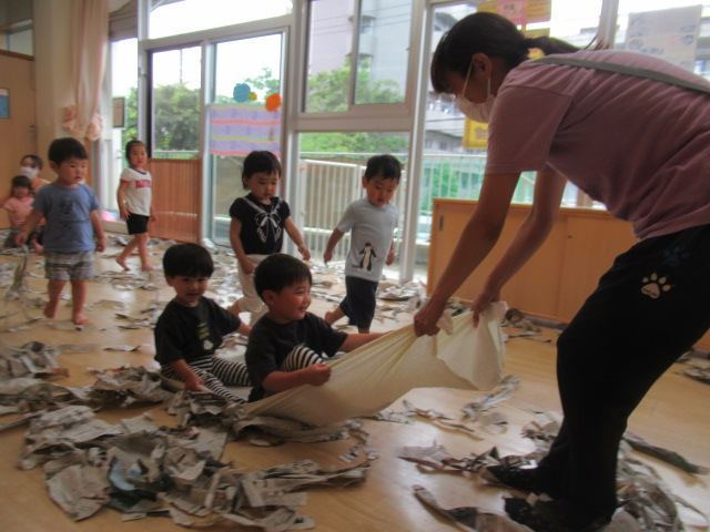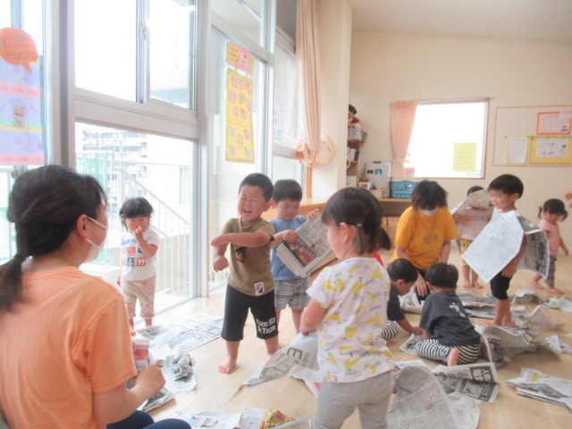 お部屋で新聞紙をビリビリ破って楽しみました!少しだけ破ればお洋服。折って素敵なお帽子や「いないない バァ~」とビリビリ破ってお顔が出てきたよ~たくさん破ったら新聞プールだぁ~とプールごっこもやってみました。暑くなってきたので今度は雪遊びだよ~と雪に見立ててバスタオルでのソリ遊びも楽しみました。最後は、みんなでゴミ収集車に変身して新聞を集めてくれました。お片付けも楽しみながら綺麗なお部屋になりました♬ たくさん遊んだので水分補給をして給食の時間までゆっくり自由遊びも楽しみました。