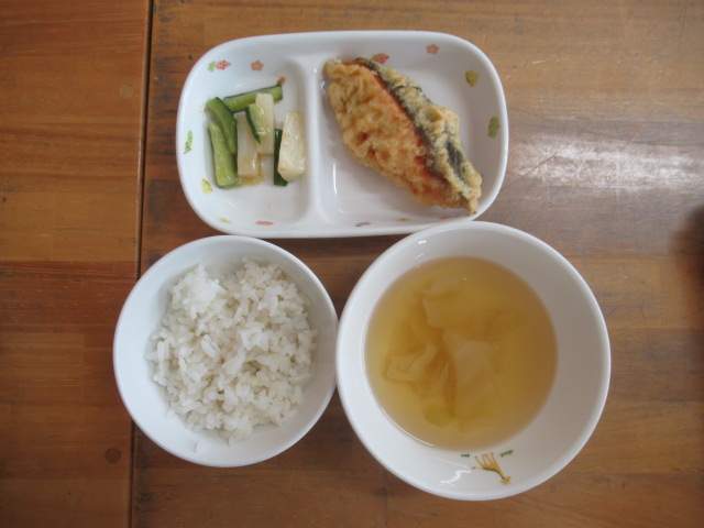 部屋を2つに分け、電車コーナーとおままごとコーナーにして、好きな方でゆっくりと遊びました。今日は気温が高くなく、風も強かったのでシャワーはしていません。