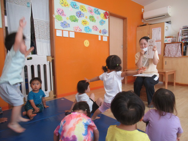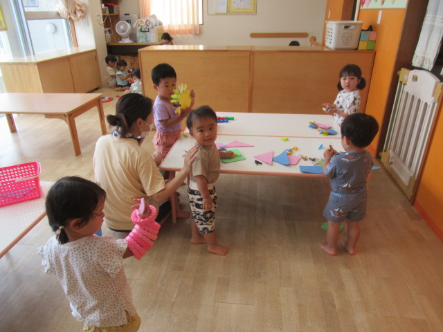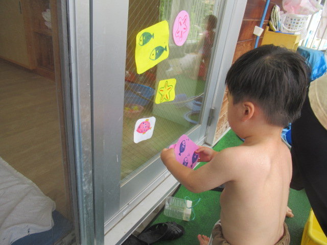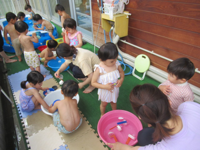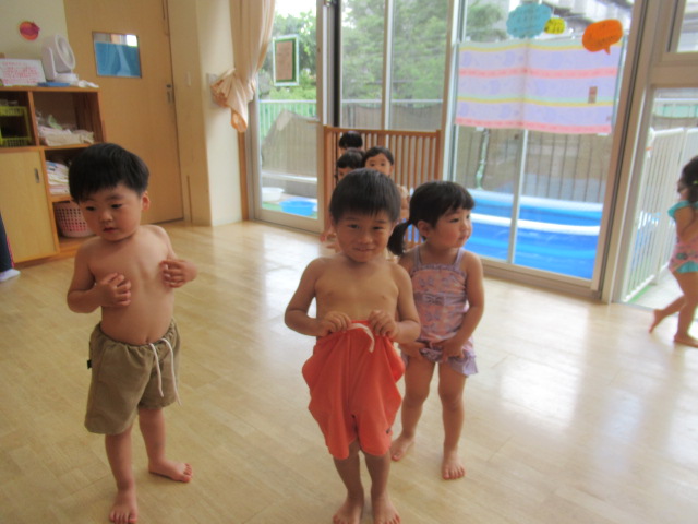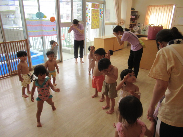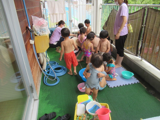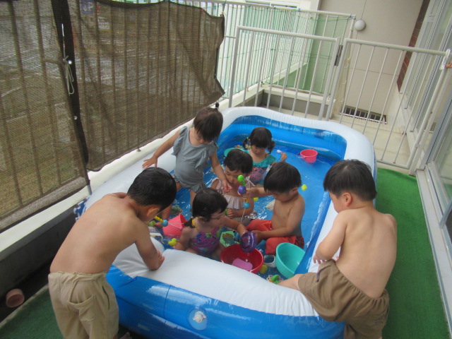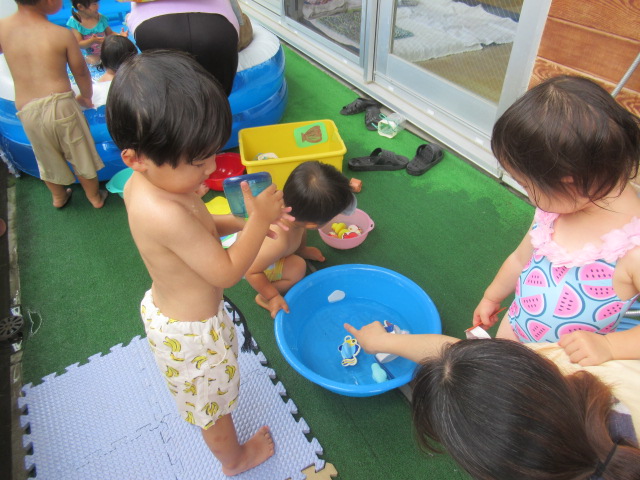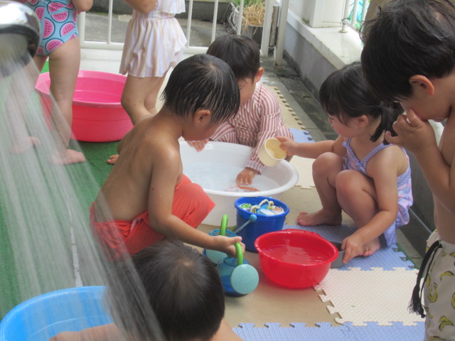 今日は待ちに待ったプールで水遊びをしました😊朝のお集まりをした後、お茶を飲み水分補給してからトイレに行き、水着に着替えました。自分の水着を探して取って、出来るところまで自分で着替えました。みんな自分の水着をしっかりと分かっていて嬉しそうに教えてくれていました。プールで遊ぶ前に「めっちゃ元気体操」でしっかり体を動かして準備をしてからプールへ行きました。タライで魚釣りをしたり、プールに入ってペットボトルのバケツで水をくんだりして、思い思いに水遊びを楽しんでいましたよ!