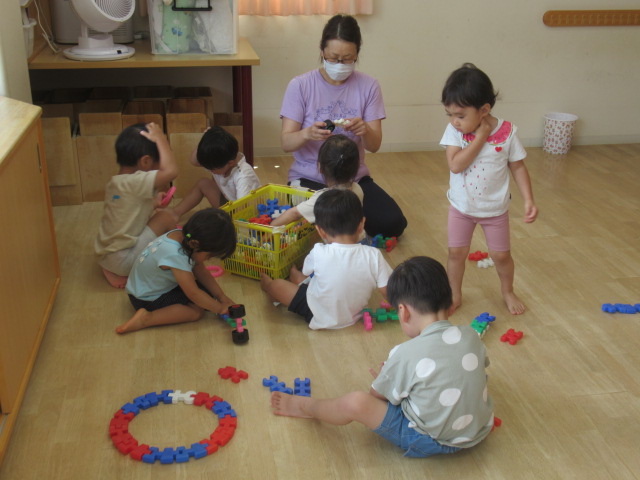 その後に洗濯バサミとブロック遊びのコーナーに分かれてほっこりと遊びました。