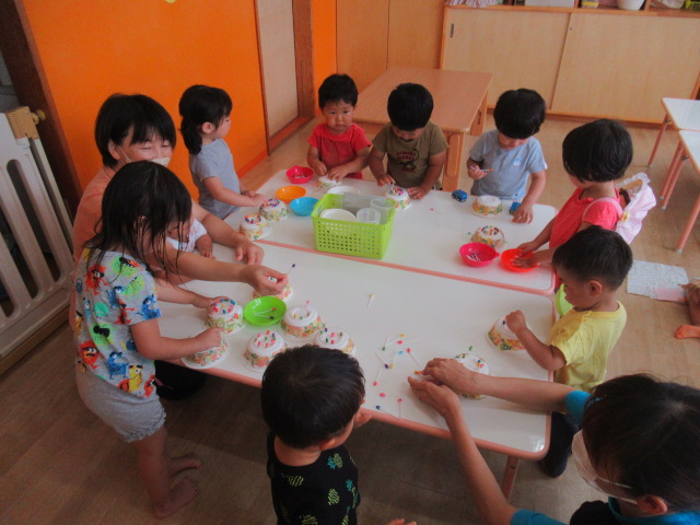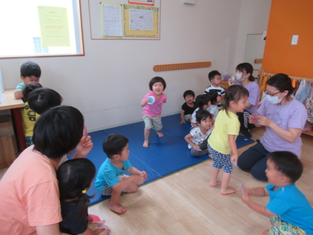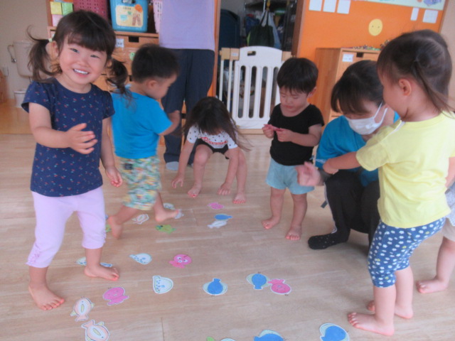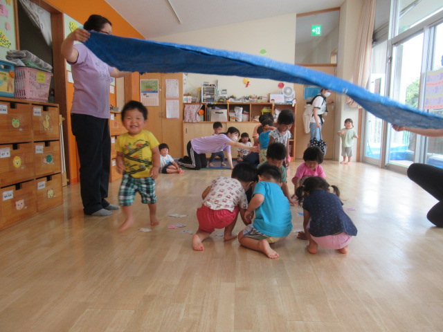 ブルーシートを波のようにユラユラさせて、シートをくぐってお魚をとりに行くという遊びをしました。タコや、いろんな魚がいたので選んで手に取る子、たくさん手に持ちたい子など様々でした。ユラユラとブルーシートが揺れるのでキャッキャと笑い声も出ていました。最後はうそっこでお魚を食べました。