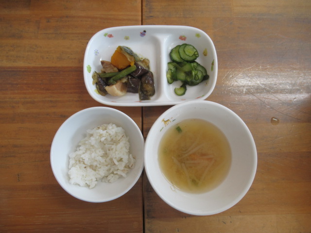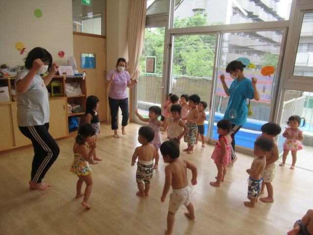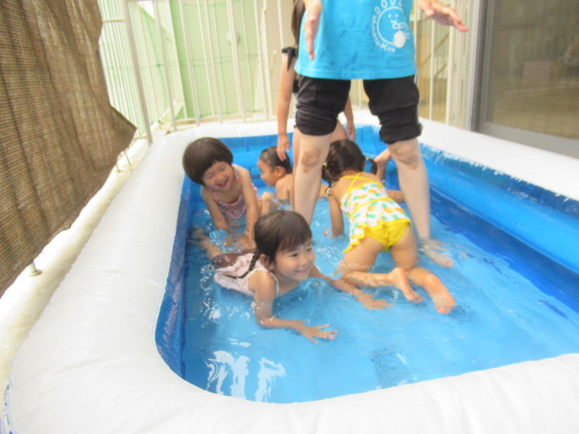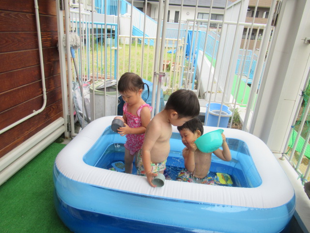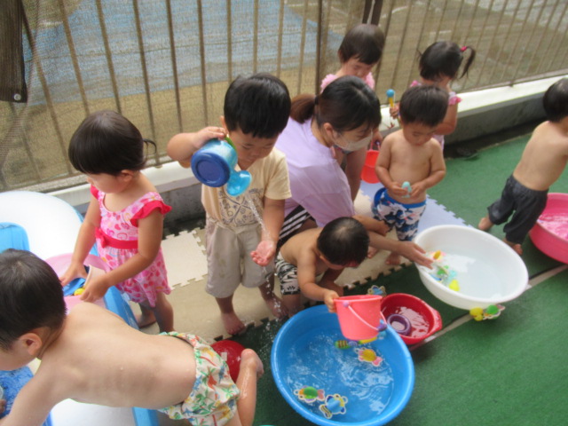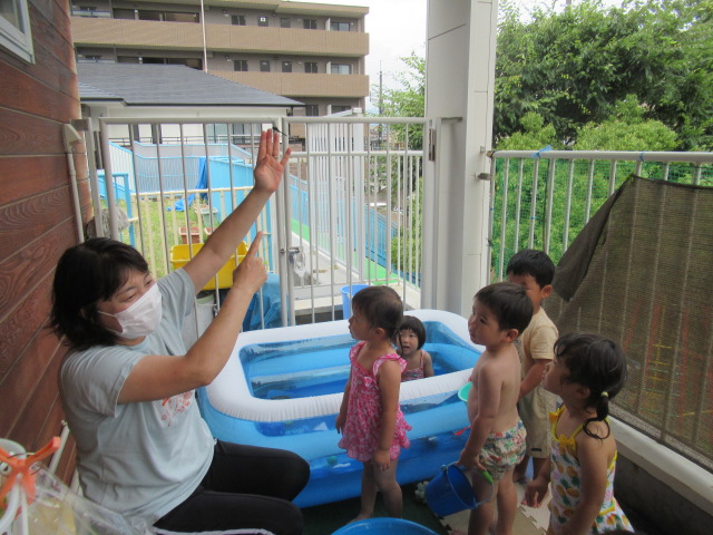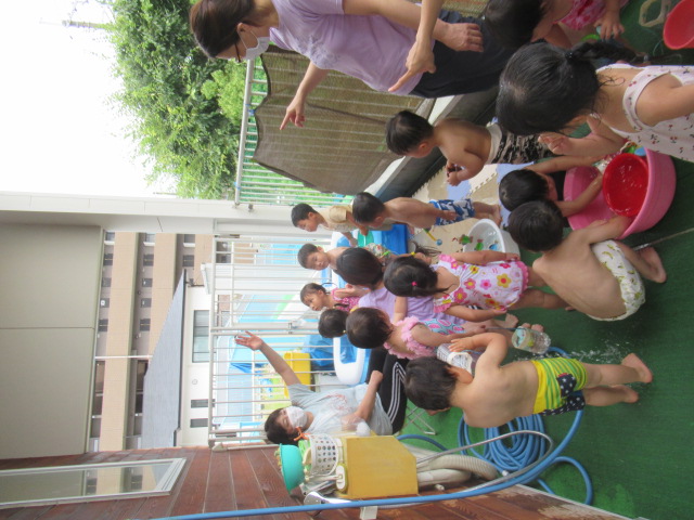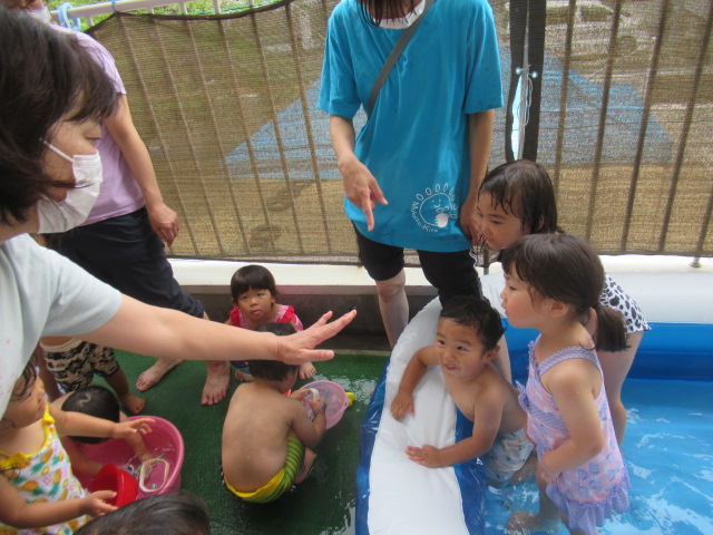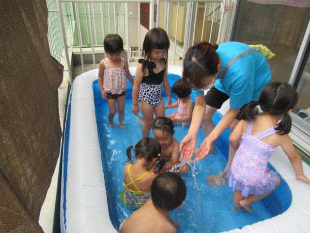 回を重ねてきたので子どもたちの耳にも体にも馴染んできたかなと思います「めっちゃ元気体操」。今日も楽しく体を動かしてからプールへ入りました。水の中入ったプールに入るのはちょっと勇気がいるな…というお友だちもいるので、タライにお水をためて水遊びができるコーナーも用意して、無理なく遊べるようにしています。遊んでいる途中、トンボがやってきて保育士の手に止まりました。しばらく逃げなかったのでみんなで観察しました。