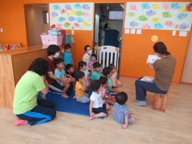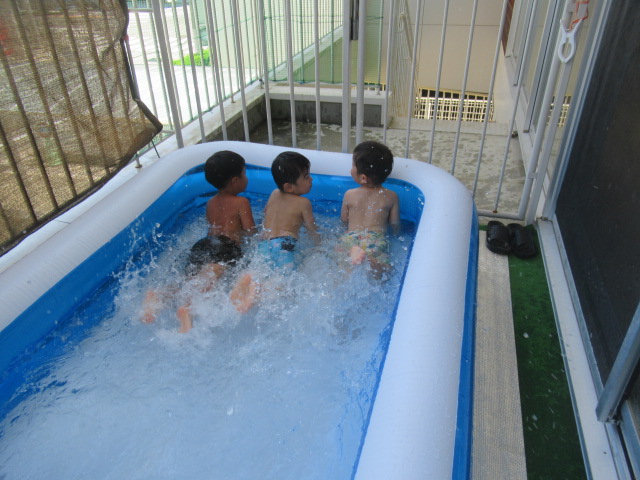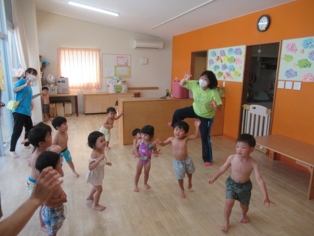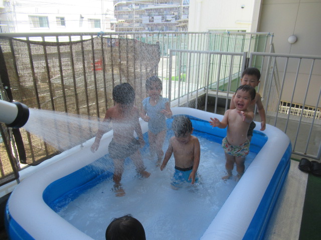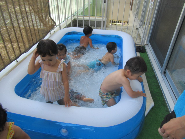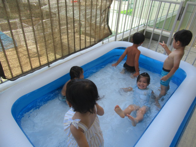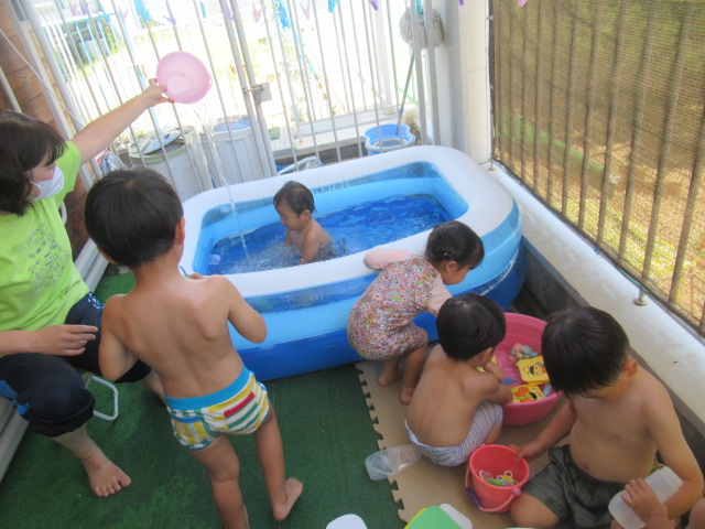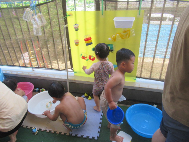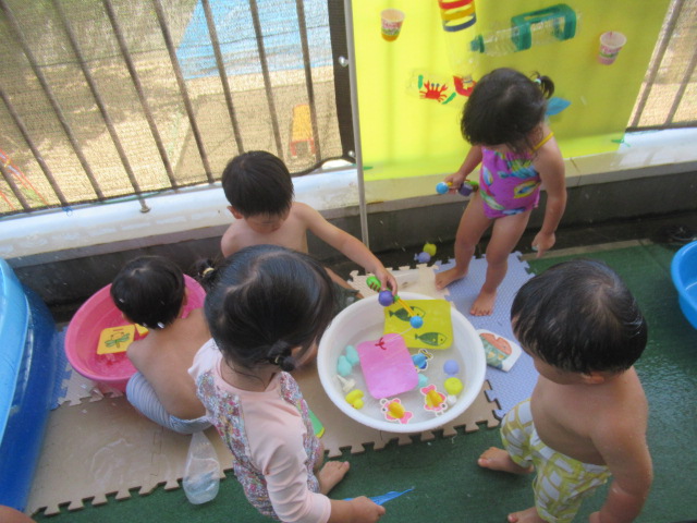 今日も元気に体操をしてプールへ。プールが始まってすぐの時より、遊び方が少しずつ大胆になってきたように感じます。水の中で足をバタバタさせたり手で水しぶきを上げたり自由に体を動かして、気持ちよさそうでしたよ。水に手を付けるだけでも気持ちよくて、魚釣りなどの水遊びも人気でした。
