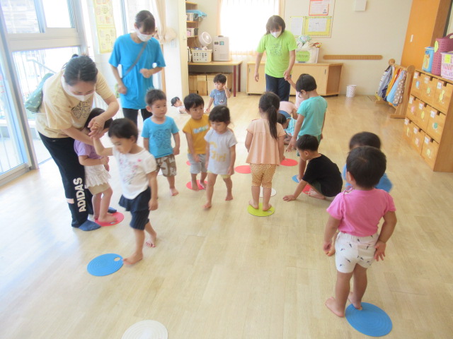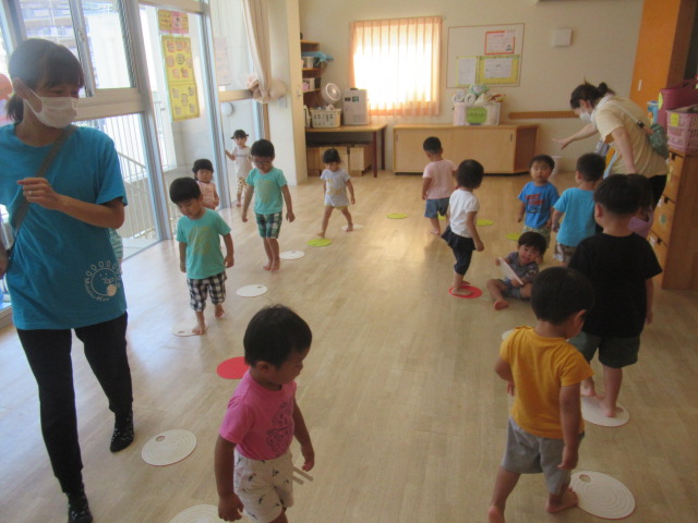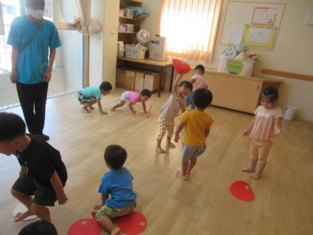 フラットマーカーという丸い形の、目印になるものを使って遊びました。最初は椅子取りゲームのように人数分フラットマーカーを床に用意して始めました。ピアノが鳴ったら歩いてね、ピアノが聞こえなくなったら丸い(印の)ところに座ってねとルールを伝えました。初めてやるような遊びだったので、今日は大人が一緒にするのをみながら真似っこをして、見よう見まねでやっていた子どもたちです。回を重ねると楽しくなってくるかな?と思います。