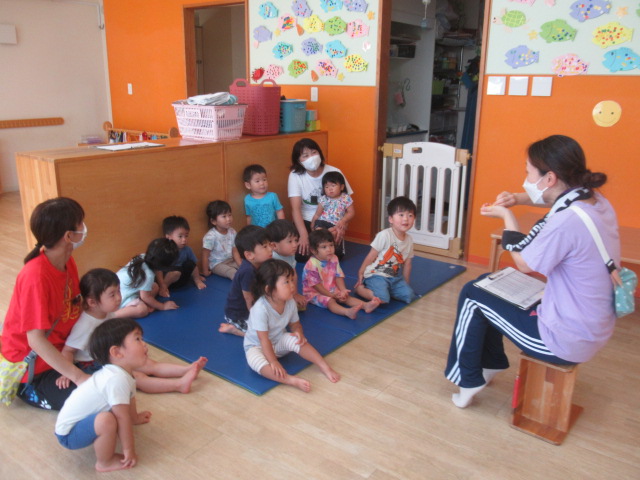 手の中にかくれている物が何かをみんなに当ててもらうゲームをしました。少しだけ見えるようにすると、すぐに何か分かったお友達がいてビックリ!じーっと見て考えている顔がみんなとっても真剣でしたよ!