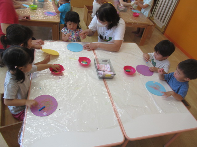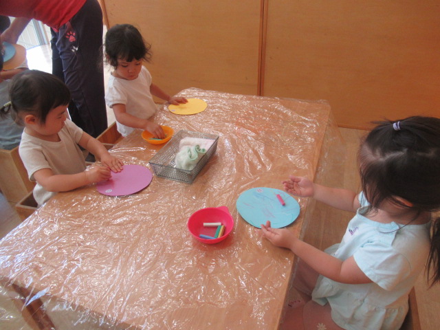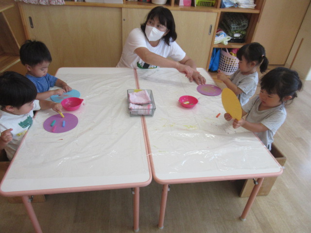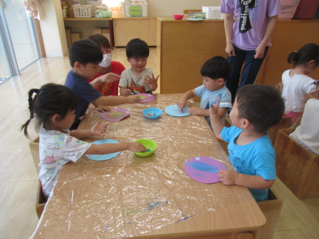 8月の壁面制作で花火を作りました。丸形の画用紙にコンテで自由に模様を描き、それを指や手のひらでこすってぼかすときれいな花火の完成です!手が汚れてもそれを楽しんでいっぱい描いてこすっていましたよ!壁面に飾りますので楽しみにしていてくださいね。