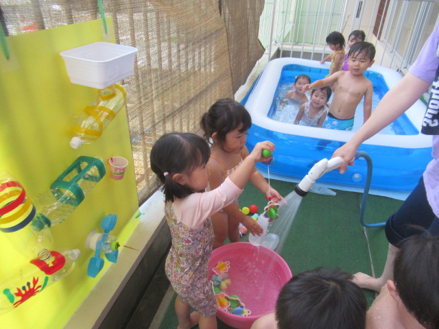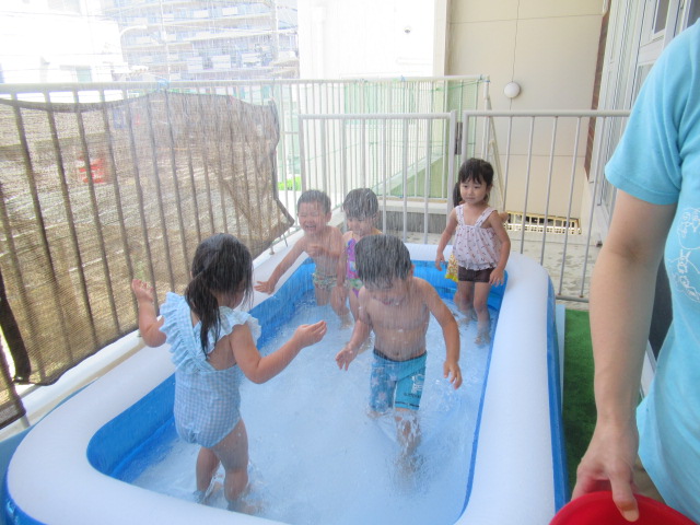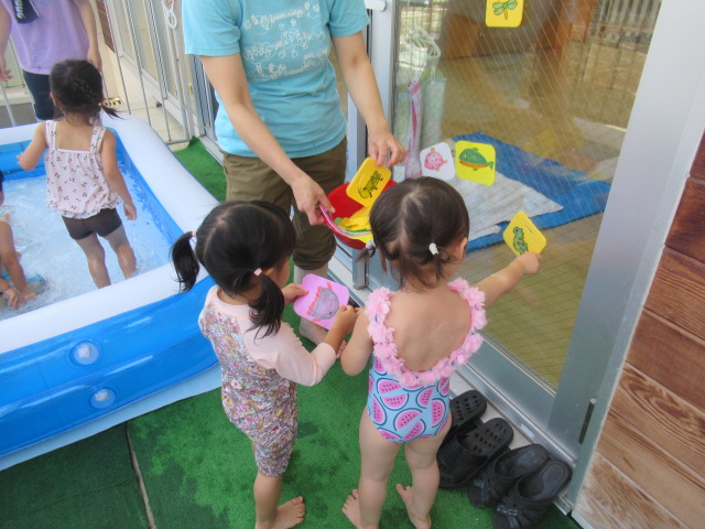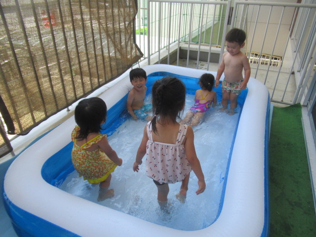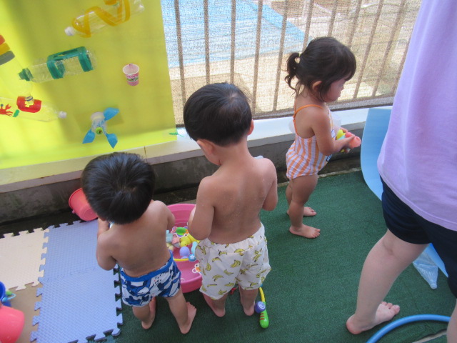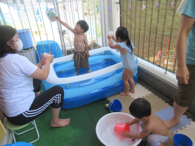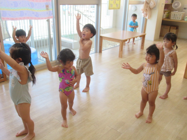 プールに入る前に踊っている「めっちゃ元気体操」をたくさんのお友達が覚えて踊ってくれています!みんな真似っ子が上手です。体操でしっかり体を動かしてからプールに入ります。大きいプールでは友達と水を掛け合ったり、ワニになって泳いだり、水飛沫が顔にかかってもへっちゃら!全身で水遊びを楽しんでいまひた。おもちゃコーナーや小さいプールで魚釣りなどが人気で、「つれたよー!」と嬉しそうに見せてくれました😊