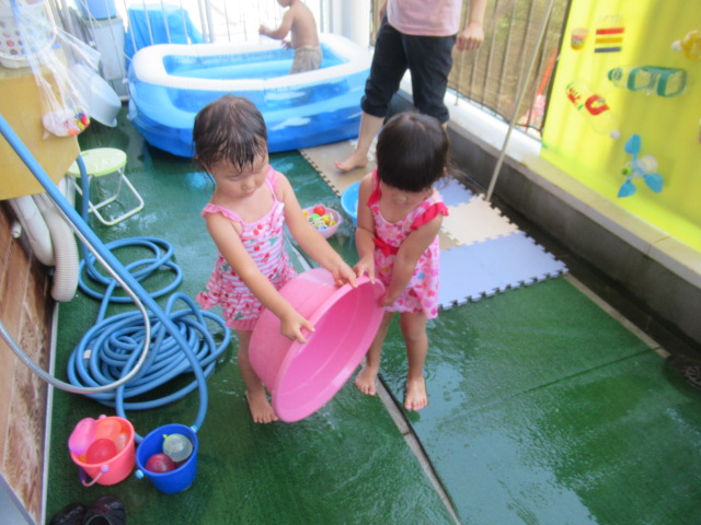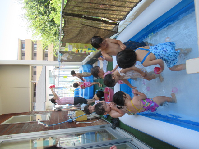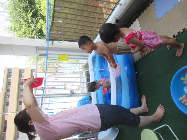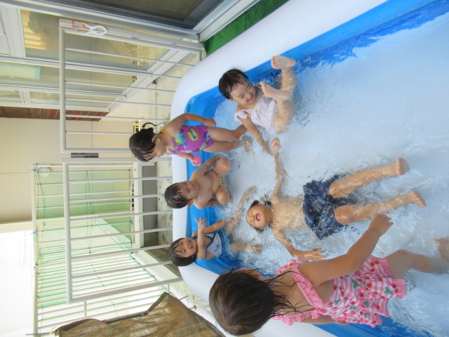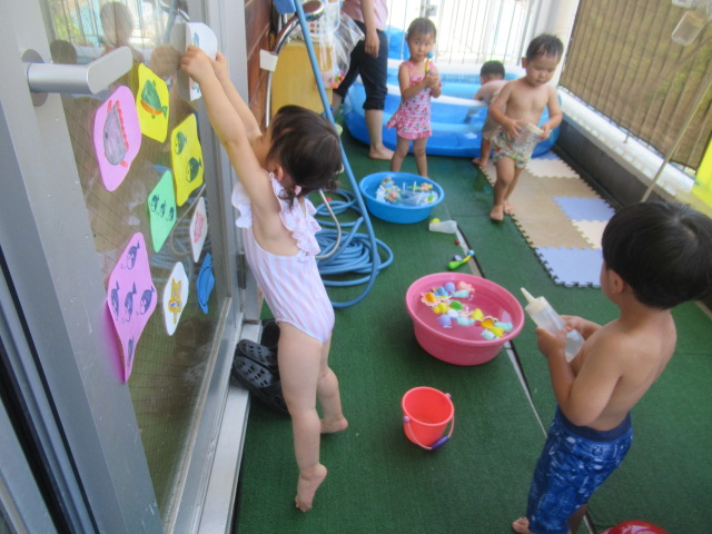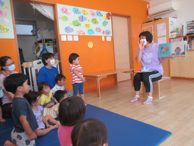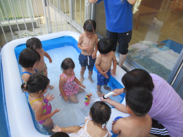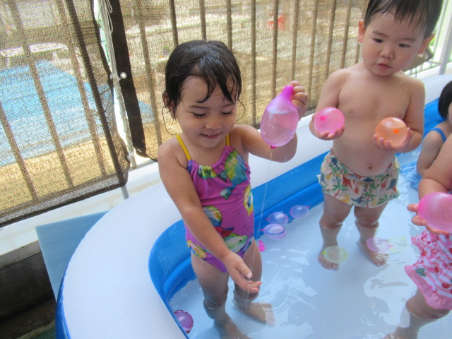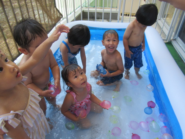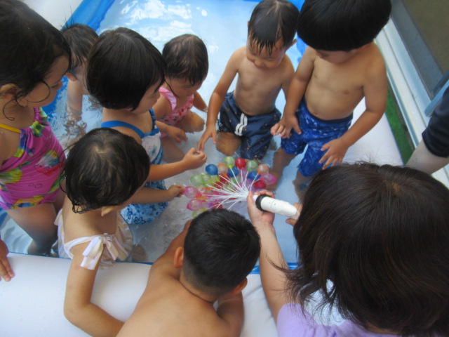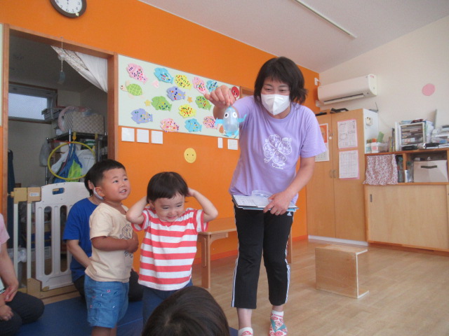 絵本『うみがだいすきさ』を読みました。繰り返し挑戦しているといつの間にか出来る様になるよ♪と勇気を貰えるお話です。絵本からあおくんが飛び出して遊びに来てくれましたよ。どんぐりのみんなも今はプールで繰り返し遊んでいますが、お友だちと誘い合ったり「こんな事出来るで~!」とやって見せてくれるお友だちを見て、私もやってみる!とチャレンジしている姿もあちらこちらで見られ、いろんな事ができるようになってきました^_^ プール前後のお着替えやバスタオルもぜーんぶ自分たちで袋の中に入れる事も出来るし、おトイレだって言える!ひとりで出来る事がたくさん増えてきましたよ♪ プールの中で一度にたくさん出来る水風船🎈を作ってみると「あおくんがいっぱい^_^」と水風船のぷよぷよした感覚を楽しんでいました。