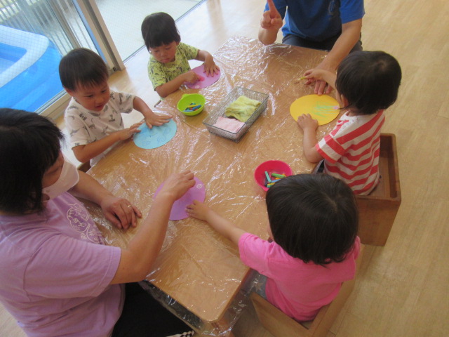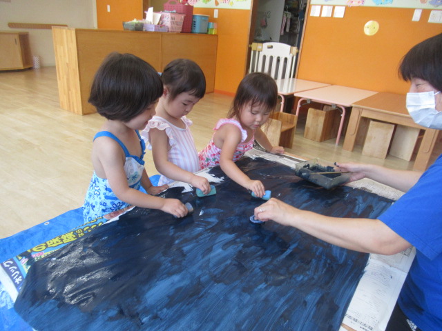 8月は、色とりどりの花火を打ち上げます^_^ 丸い画用紙にコンテで描いて指で擦ってぼかします。コンテで描く強さや指を使って擦る強さでみんなそれぞれにステキな花火に仕上がりました。手についたコンテをお隣同士で見せ合いっこして楽しんで描いていましたよ。夜空を絵の具とスポンジでトントン叩きながらお手伝いしてくれたお友だちもスポンジをうさぎさんに見立ててピョンピョンと楽しく描いてくれました♪ 壁面に飾りますので、楽しみにしていて下さいね☆