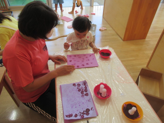 9月の壁面制作ではペットボトルキャップをスタンプにして紫色の画用紙にペッタンと押してぶどう🍇を作ります。丸い形が出てくると楽しくなって「ペッタンペッタン」と言いながら押したくさんの実が出来ました♪