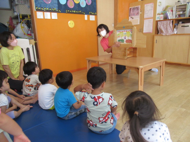 紙芝居『いちについて よーいどん』を読みました。野菜たちの運動会。みんなで力を合わせて楽しそう♪ どんぐりさんも運動会ごっこをして遊びました。